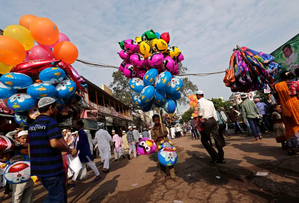 對於長時間在街頭做生意的攤販們來說,有一處蔭涼的樹蔭真的很重要。圖為印度德里街頭的一個小男孩,正在向路人們兜售氣球。