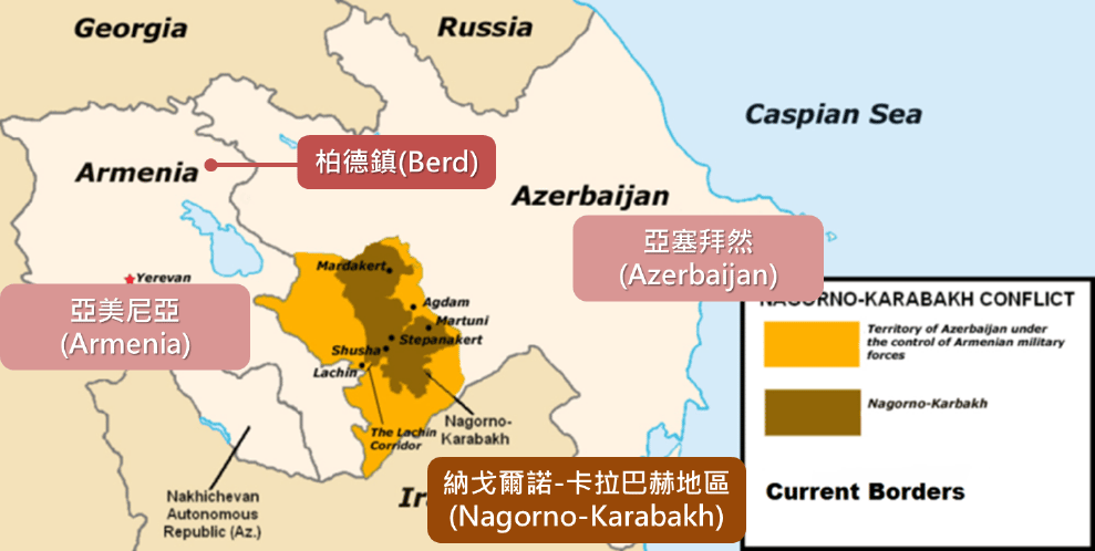 在這張兩國衝突的示意圖中,深咖啡色就是兩國間的爭議領土卡拉巴赫,亞美尼亞北方深磚紅色原點處即為本次衝突的發生地柏德鎮。