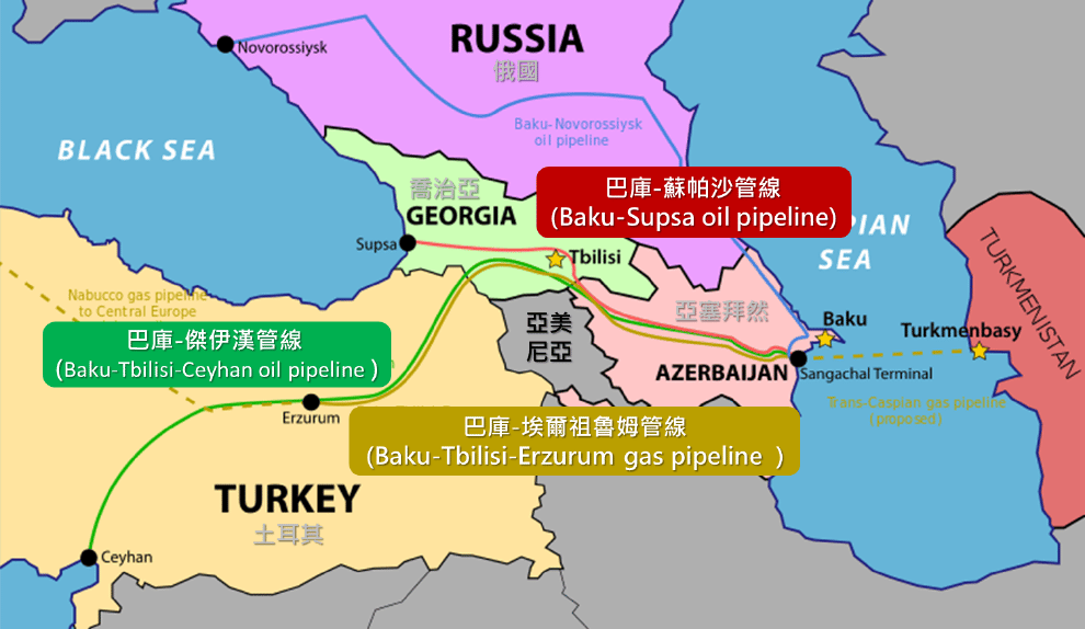 裏海蘊含豐富油氣資源,但因地處內陸,必須靠管線運至港口才能出口。目前,亞塞拜然境內總共有四條管線出口裏海能源,一條行經俄國最終抵達黑海;三條借道喬治亞,但有兩條之後往南經土耳其出口;餘下一條則自喬治亞抵達黑海。