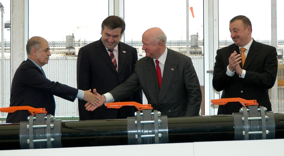 圖為2005年的巴庫-傑伊漢油氣管線落成典禮。畫面中從左到右分別為時任土耳其總統的塞翟(Ahmet Necdet Sezer)、時任喬治亞總統的薩卡希維利(Mikhail Saakashvili)、時任美國能源部長的博德曼(Samuel Bodman)、時任亞塞拜然總統阿利耶夫(Ilham Aliev)。