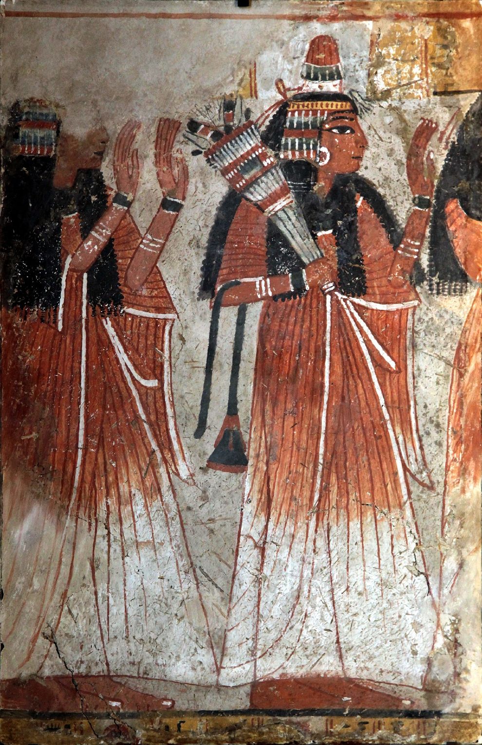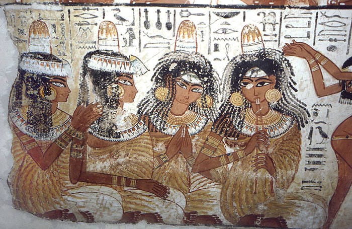 在這幅古埃及壁畫中,可以看到身穿禮服、頭戴圓錐頭飾的女子。