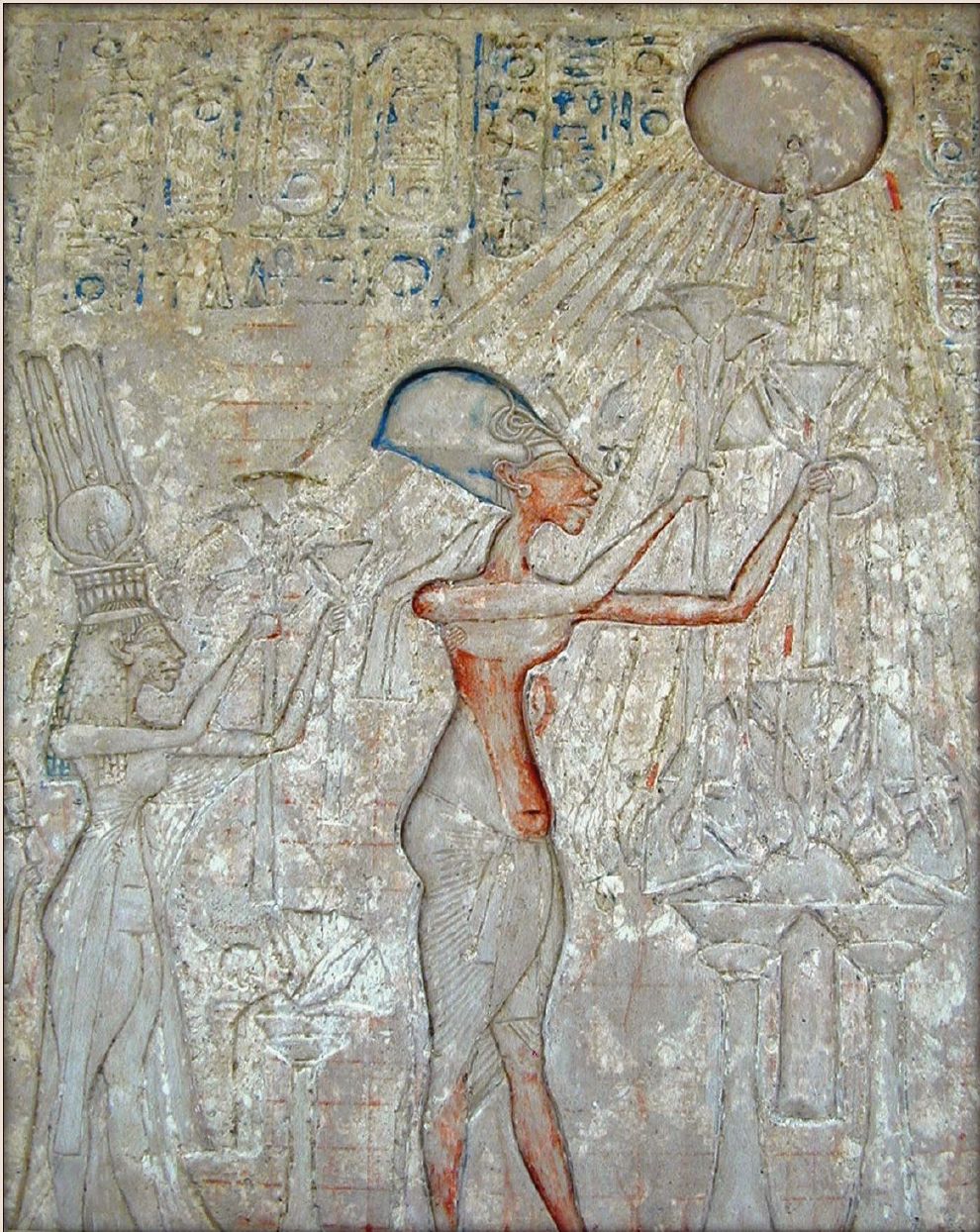 圖為和家人一起膜拜太陽神阿頓的古埃及第十八王朝法老阿肯那頓。