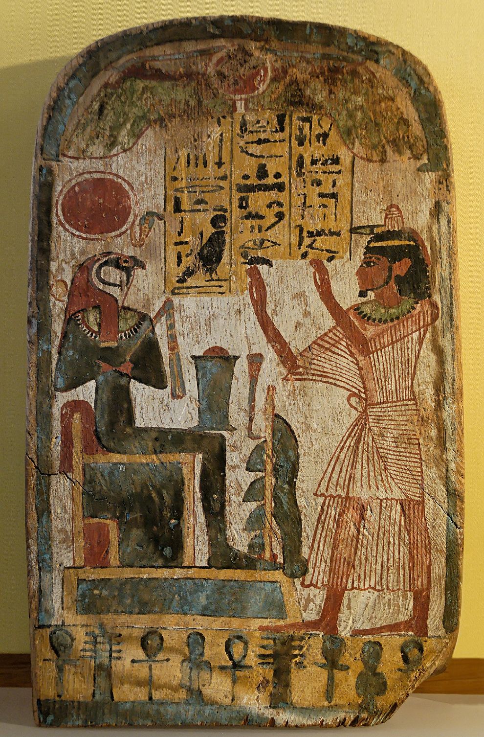 除了在宴會的場合可以看到圓錐頭飾,在敬神儀式上也可以看到古埃及民眾頭戴圓錐頭飾。圖為頭戴圓錐頭飾的古埃及祭司正在敬拜法老的守護神荷魯斯(Horus)。