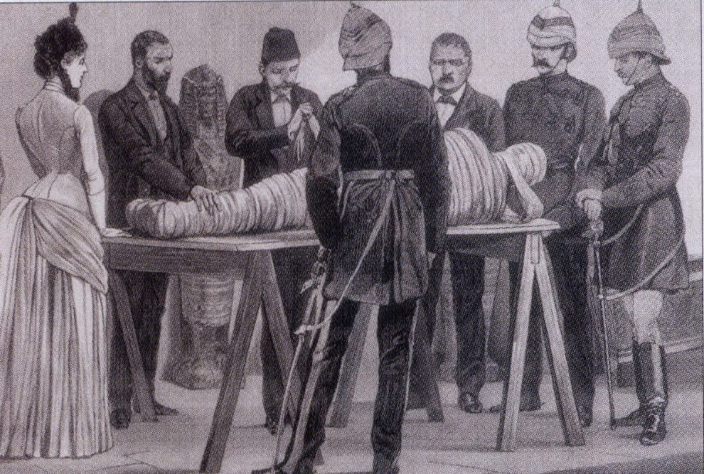 十九、二十世紀之際的法國埃及學家 Gaston Maspero 正在檢驗一具木乃伊。圖片來源: Wikimedia Commons