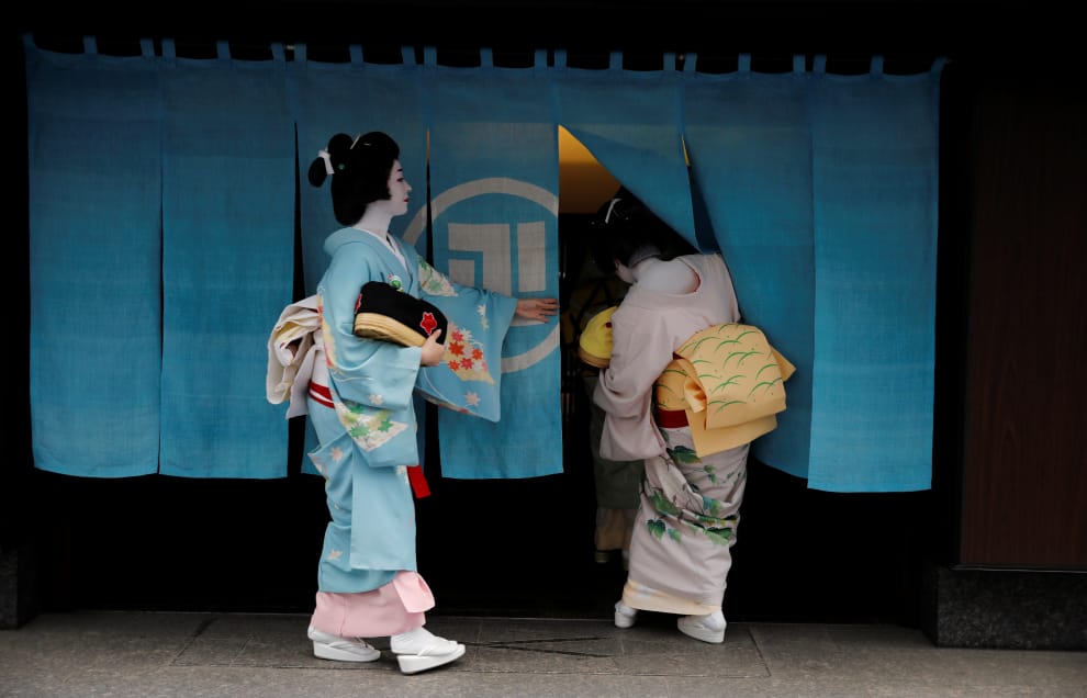 路透社 / 達志影像藝妓真由(右)與小郁(左)掀開東京赤坂豪華餐廳淺田屋 (Asada) 的門簾,待會就要替賓客帶來一場精采的表演。