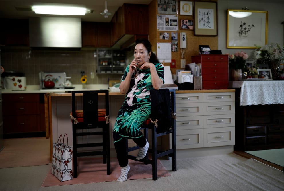 今年 80歲的藝妓育子在家中講電話,自從疫情來襲,她的表演場次驟減,收入也大不如前。