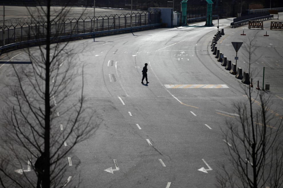 在金正恩的一聲令下,開城及周遭地區都已經進入封城。圖為 2013年,一名南韓士兵走在開城工業區內一條空無一人的道路上。
