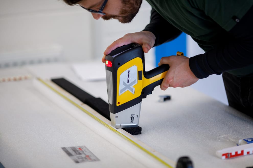 來自布萊頓大學(University of Brighton)環境與技術學院的專家奇博羅夫斯基(Jake Ciborowski)正在分析菲利浦斯提供的圓柱樣本。上面這張照片中,下方黑色長方體和上方黃色捲尺之間,依稀可以看到一個白色的圓柱形物體,即為菲利浦斯提供的樣本。