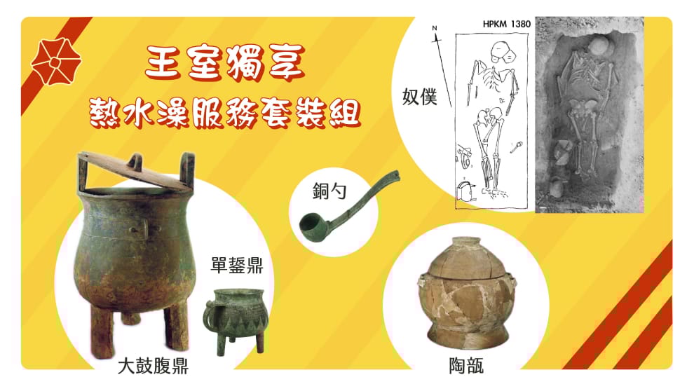 比對商王與后母戊的祭祀坑可以推知,大鼓腹鼎、單鋬鼎、陶瓿、斗或勺以及殉葬的奴僕,是王室獨享的熱水澡服務套裝組。