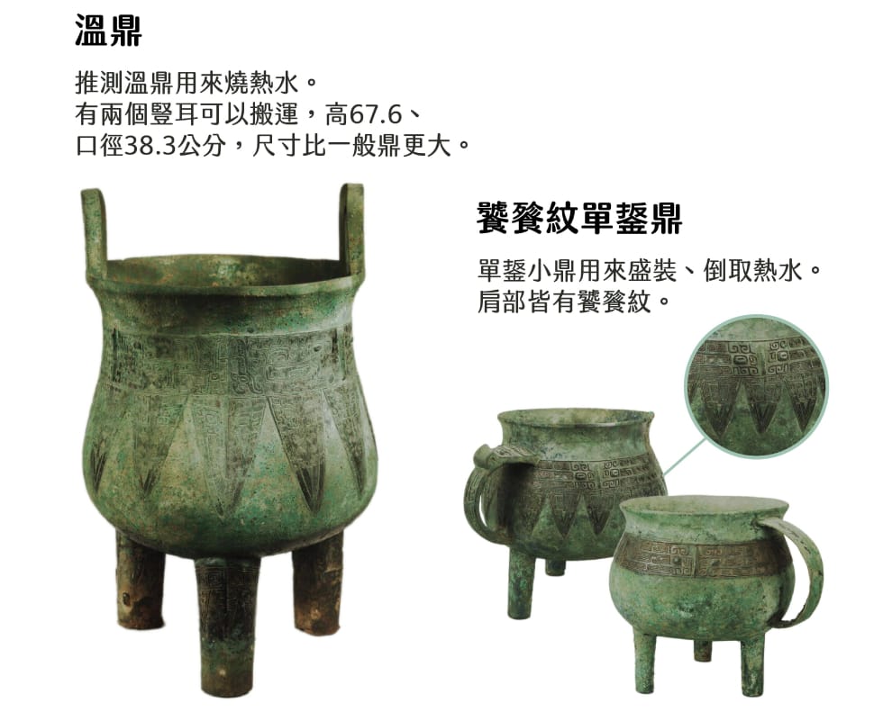 造型、用途皆有玄機。商代鼎多為直身,水桶腰;這三件鼎則是少有的葫蘆狀,受熱面積較大。其中最大件的形式是鼓腹鼎,器身有銘文「溫」,稱為溫鼎。在古代,溫與浴、湯(熱水)密切相關,因此可推測溫鼎是用來燒水;另外兩個單鋬(音同判,把手之意)小鼎則是盛裝、倒取熱水。