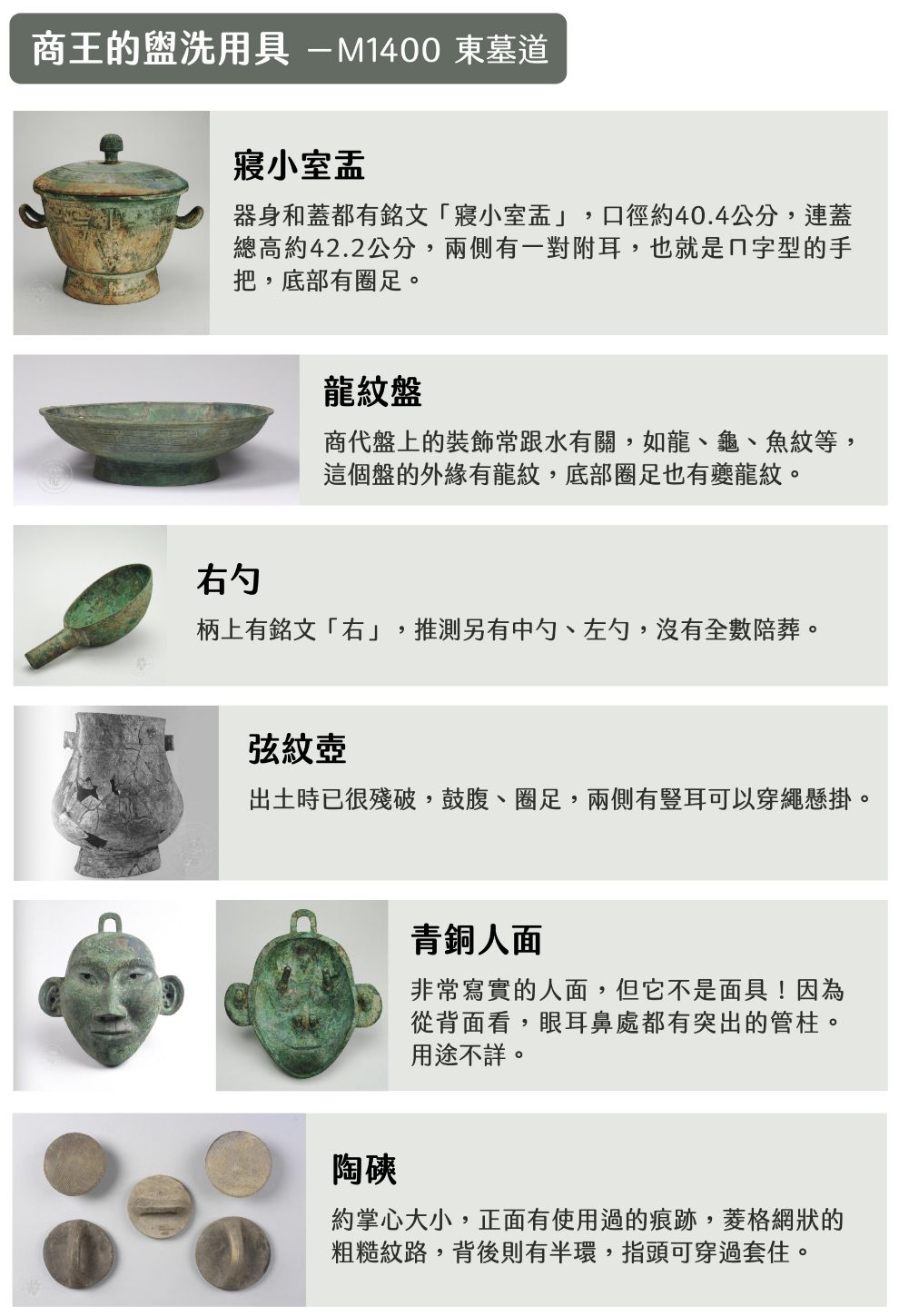 所幸盜墓者多半鎖定棺木大坑,考古學者在四周墓道仍發掘出不少文物。其中, 1400 大墓的東墓道就遺留了一組「漏網之魚」:寢小室盂、右勺、龍紋盤、弦紋壺、青銅人面、五件陶磢(音同闖)。