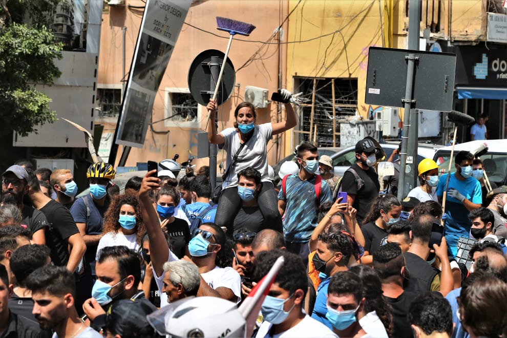 在貝魯特街頭,民眾拿著清潔用具清掃災後現場的同時,也挺身抗議政府施政不力,放任硝酸銨造成公共安全事故。