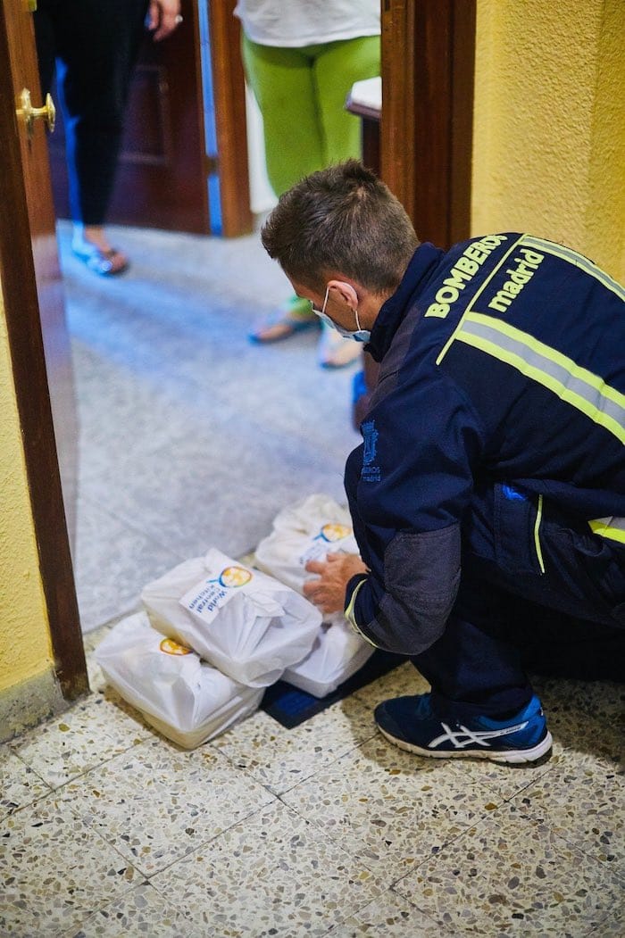 世界中央廚房在馬德里,除了有當地志工協助清潔廚房、分裝餐盒外,市政府派出消防隊員與郵差們負責配送餐點到需要的人家裡。