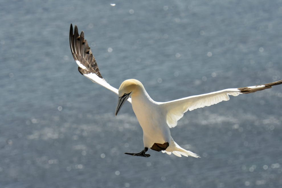海鳥糞對生態或是人類都有莫大的效益,但國際鳥盟卻發現,約 1/3的海鳥物種正面臨絕種威脅。圖為一隻展開雙翅的海鳥北方塘鵝(Morus bassanus)。