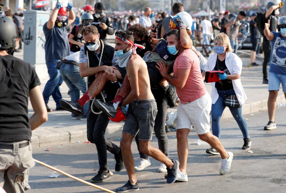 在貝魯特示威現場,民眾將受傷的同伴抬到安全的地方休息。