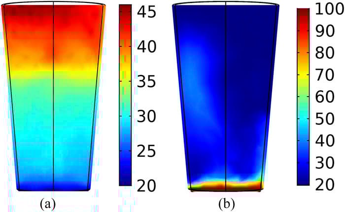 當科學家分別將水用微波爐和爐子加熱開水 90秒後,開水的溫度分別如圖中所示:圖(a)是使用微波爐加熱的開水,上、下層開水出現溫差;若使用爐子加熱開水,水溫則會如圖(b)所示。