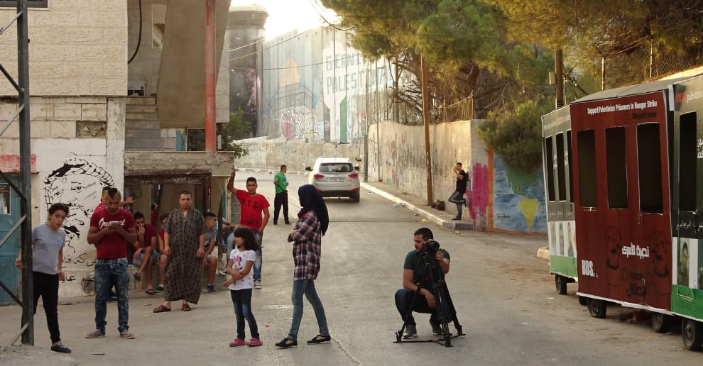 隔離牆外的以色列軍人拿著催淚彈走進難民營,有人拿出攝影機記錄。