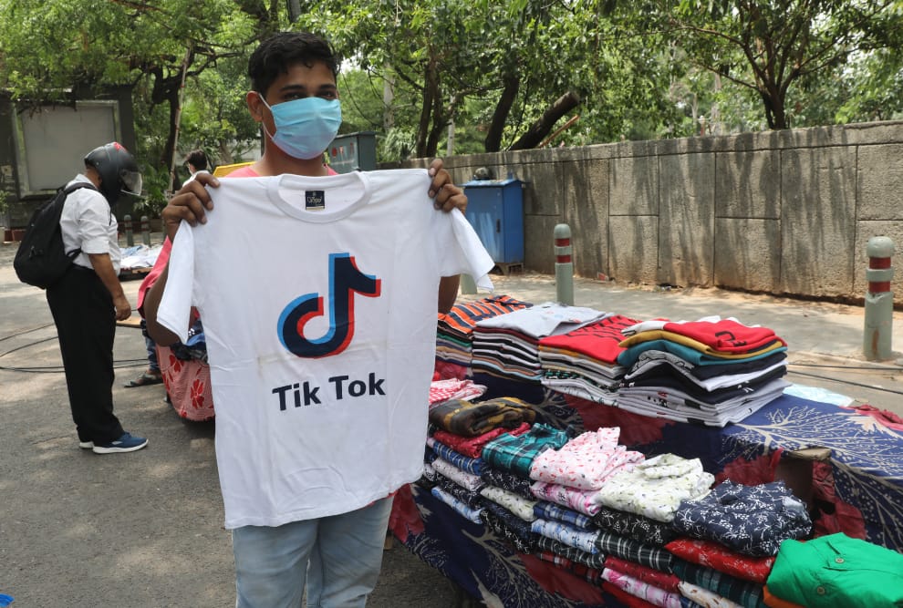 在印度新德里,一名小販秀出了印有TikTok LOGO的T恤。在今年六月底發生中印邊界衝突時,印度下令禁用包含TikTok在內的 59款中國app。
