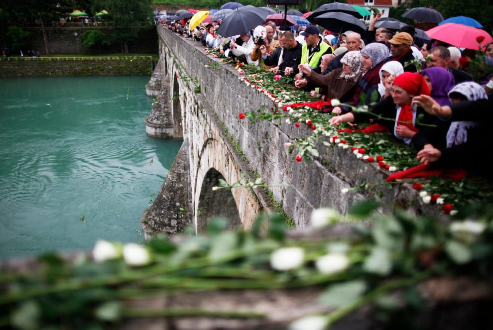 2012年5月26日,波士尼亞人來到位於維舍格勒市德里納河上的石橋,將 3,000朵玫瑰拋進德里納河中,悼念當地在波士尼亞戰爭中身亡的 3,000名受害者。