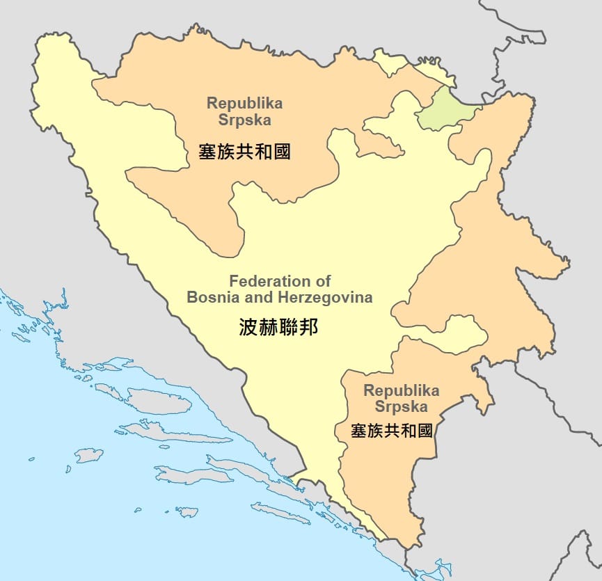 圖中黃色區塊是波赫聯邦,橙色區塊是塞族共和國,這兩個政治實體組成了獨立國家波士尼亞與赫塞哥維納。