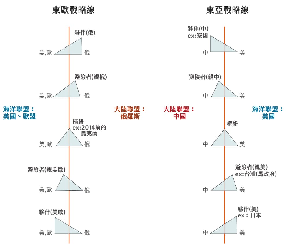 海洋聯盟(美國、歐盟)與大陸聯盟(中、俄)的對峙,分別在東亞、東歐形成兩條戰略斷層線。位在斷層線上的中小國家,在戰略三角關係中大約可扮演五種角色。