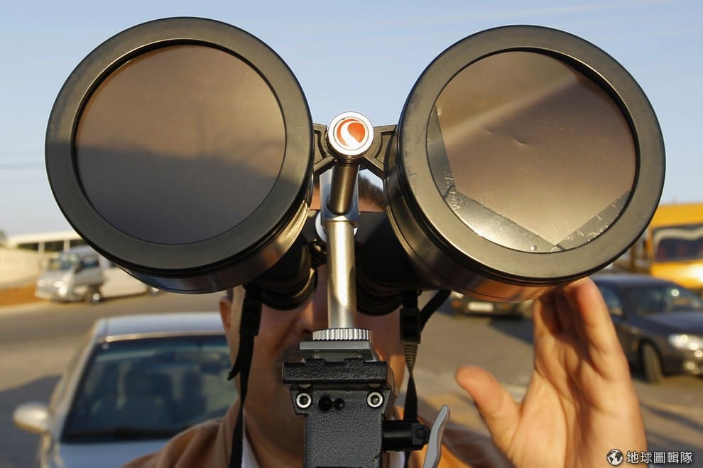 路透社把望遠鏡用遮光片擋住,做好萬全準備的民眾等待重要時刻。