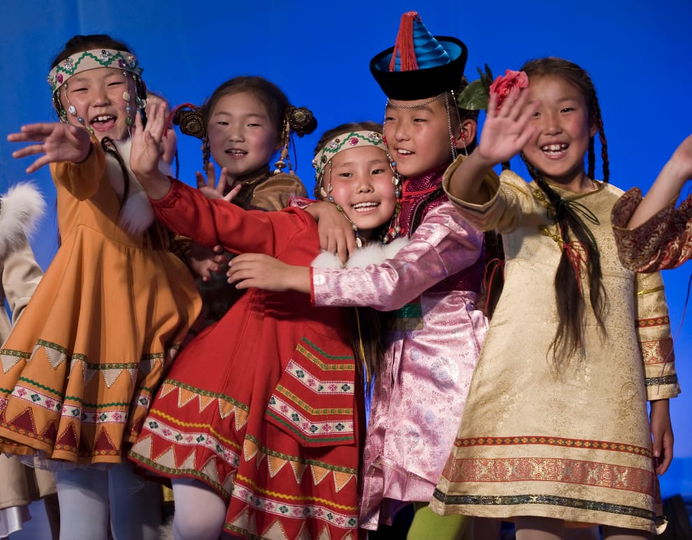 在內蒙古自治區的呼倫貝爾市,一群來自合唱團的兒童正在台上表演。
