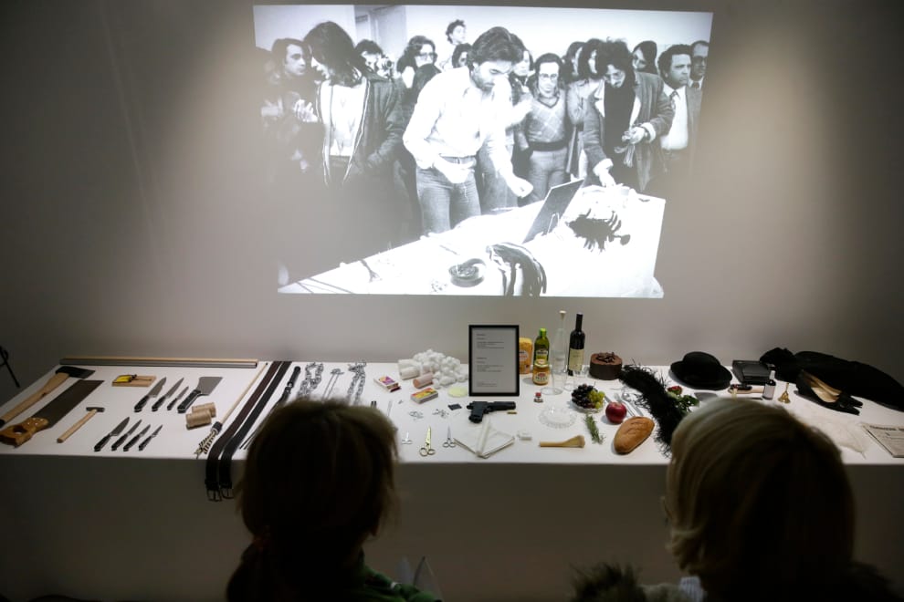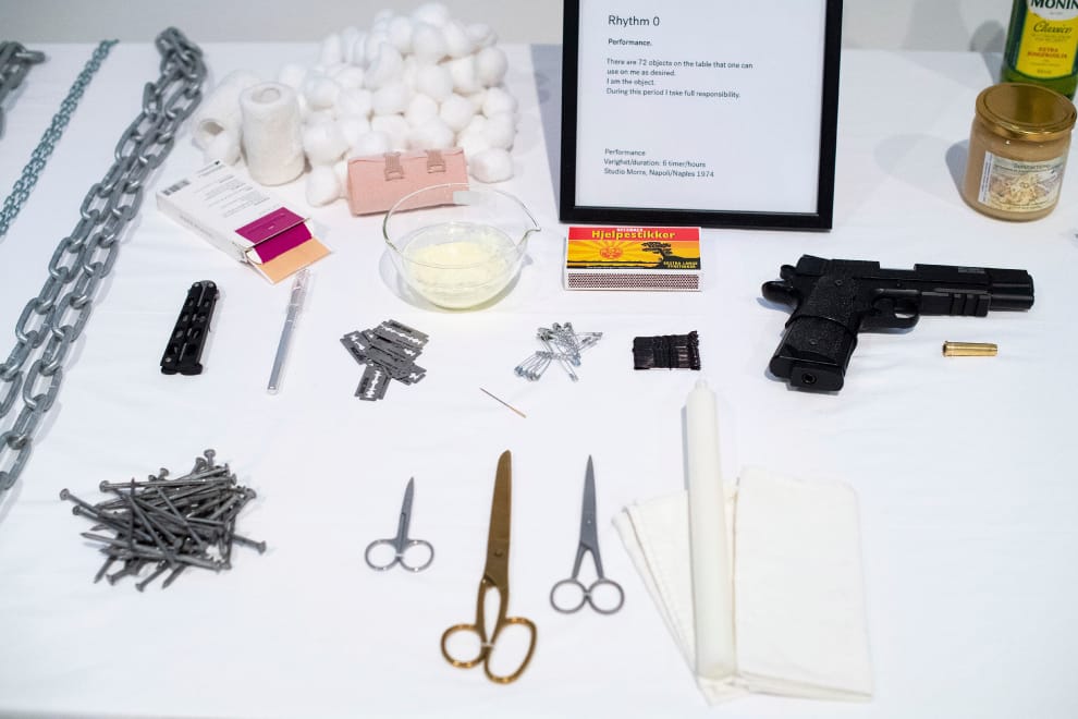 歐新社 / 達志影像當時,阿布拉莫維奇為觀眾準備了剪刀、槍枝、子彈、鎖鏈、鐵釘等物品,桌上的表演說明單寫道:「我是一件物品,在這六小時內發生什麼事,我都會負全責。」