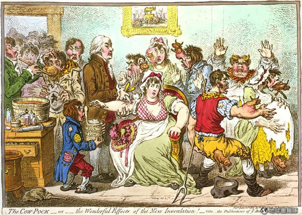 就像本文開版圖的漫畫描述當時的社會一樣,那時的人們對於接種牛痘存有很大疑慮,原因是他們認為種牛痘會長出牛角與牛毛。人類對於未知的恐懼,從未間斷。