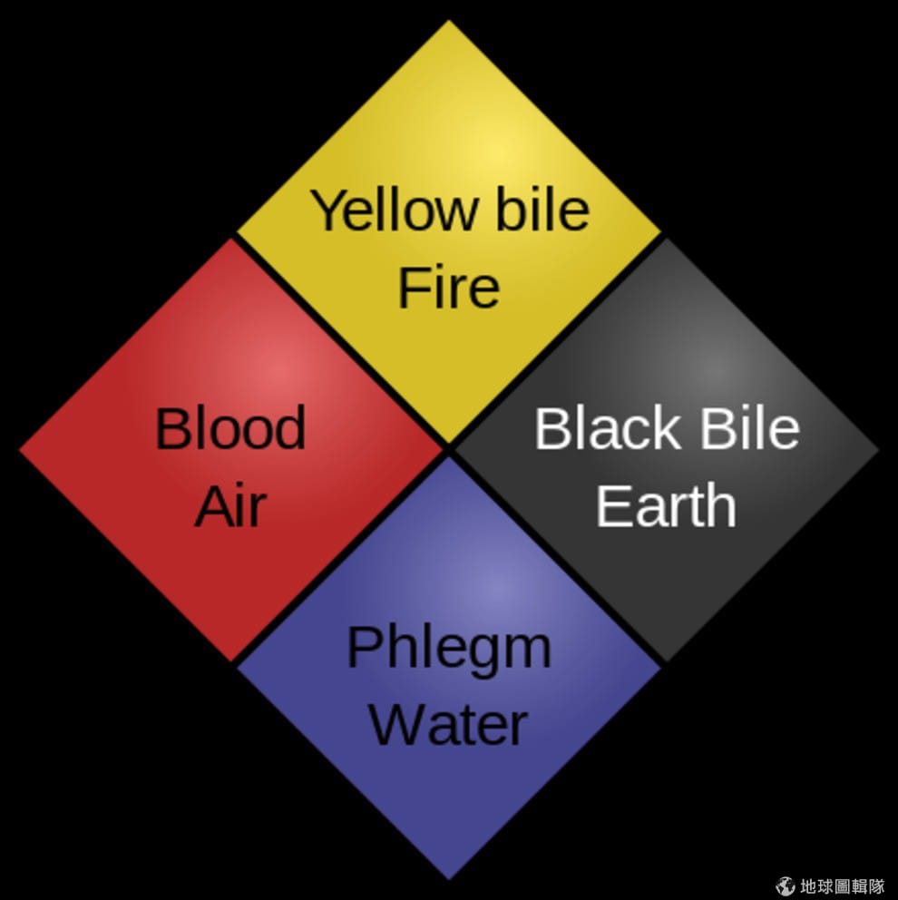 這種學說認為人體是由四種體液構成:血液、黏液、黃膽汁、黑膽汁,分別對應氣、水、火、土四種元素,當四種體液不平衡時,人就會生病。這種理論其實是被譽為「醫學之父」的希波克拉底(Hippocrates)所提出的,雖然隨著現代醫學發展已被證實是錯誤的理論,但它畢竟也歷經了兩千年,不但流傳到整個歐洲,中東、波斯、印度、西藏、中醫不同程度上都受到它的影響。
