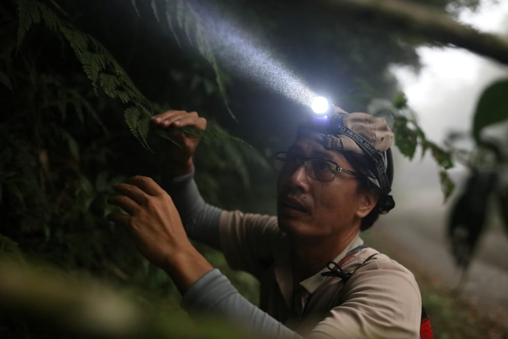 在屏東浸水營古道附近的森林,植物獵人洪信介正在工作。目前,他已經收集超過 2萬種植物標本。