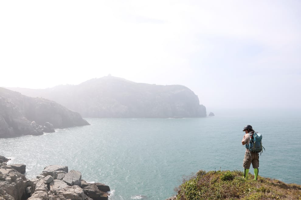 來到台東離島的洪信介,揹著台味十足的三色袋,準備開始採集植物。