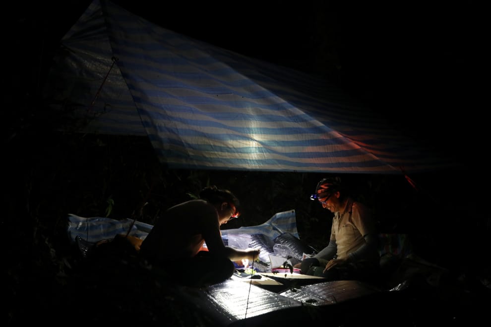 路透社 / 達志影像入夜後,植物獵人洪信介和保種中心的蒐藏經理鄭耕宇在營地中記錄他們採集到的植物。