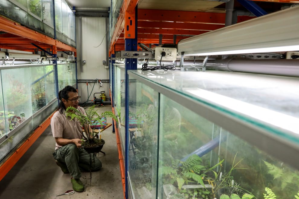 在屏東縣高樹鄉辜嚴倬雲熱帶植物保種中心,洪信介正在小心翼翼地照顧他採集回來的植物。