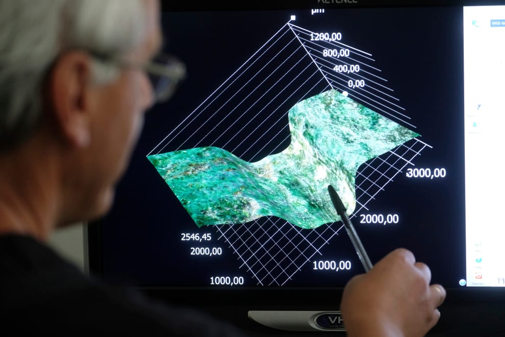 在薩克森-安哈特邦古蹟保護與考古辦公室的研究室內,考古學家正在用顯微鏡檢視一塊展示用的內布拉星盤複製品。