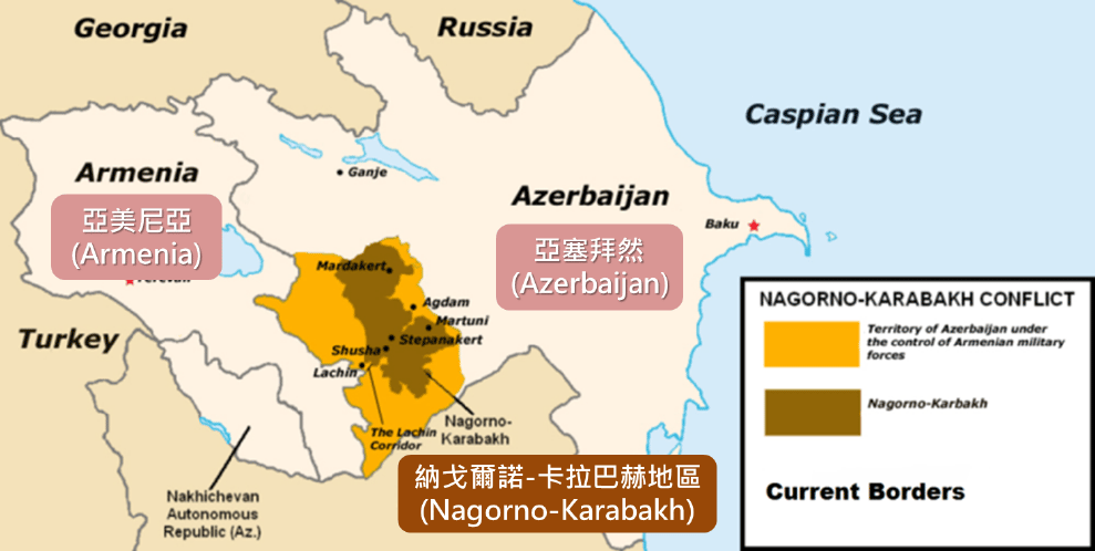 上圖中,亞美尼亞、亞塞拜然中間深咖啡色的土地,即為雙方數度交戰的導火線:卡拉巴赫地區。