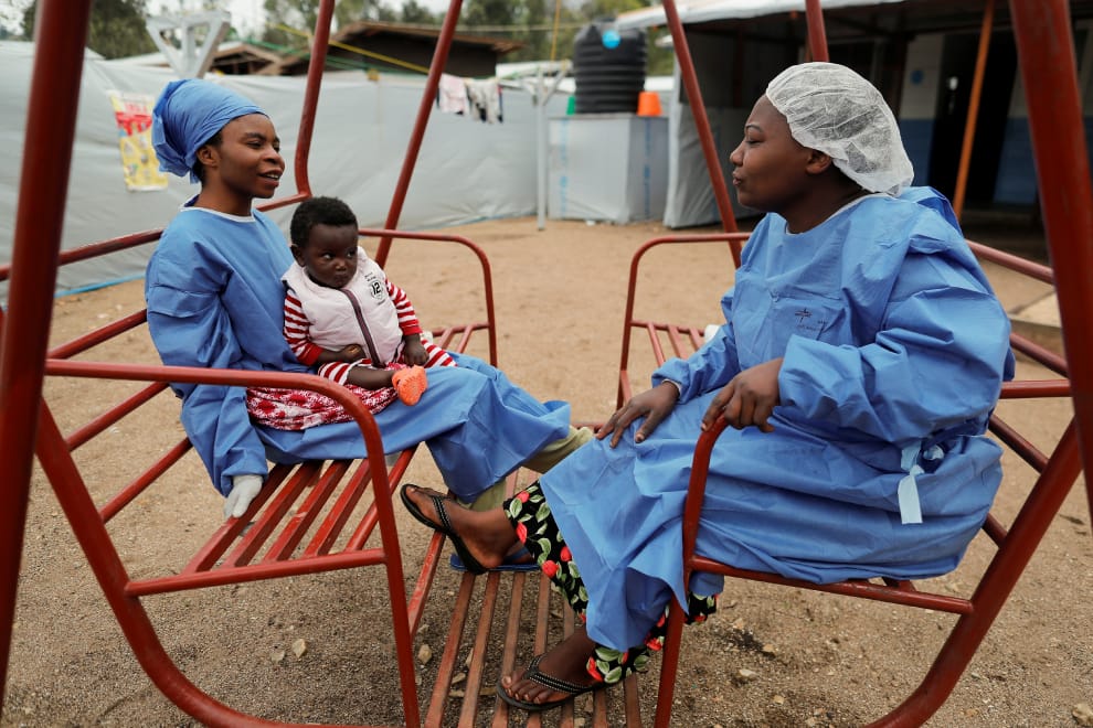 歐新社 / 達志影像在剛果民主共和國東北城市布滕博(Butembo)附近的卡特瓦(Katwa),兩名女性醫護人員正坐在一張搖椅上聊天。