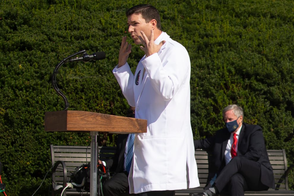 在 4號的總統病情說明記者會上,白宮幕僚長米道斯坐在一旁聽總統醫療團隊領導人康利醫生的發言,兩人對於川普的病況有不同的解讀。