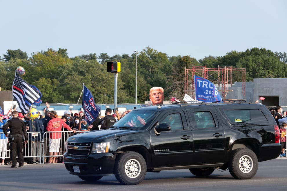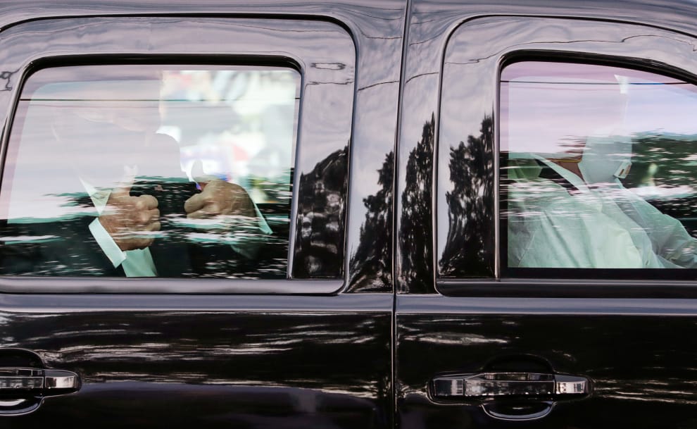 從媒體拍攝到的畫面中可以看到,染疫的美國總統川普戴著黑色口罩,從黑色四輪休旅車的後座透過窗戶向大家揮手,他也在出發前於自己的Twitter上預告這趟「驚喜小旅行」。