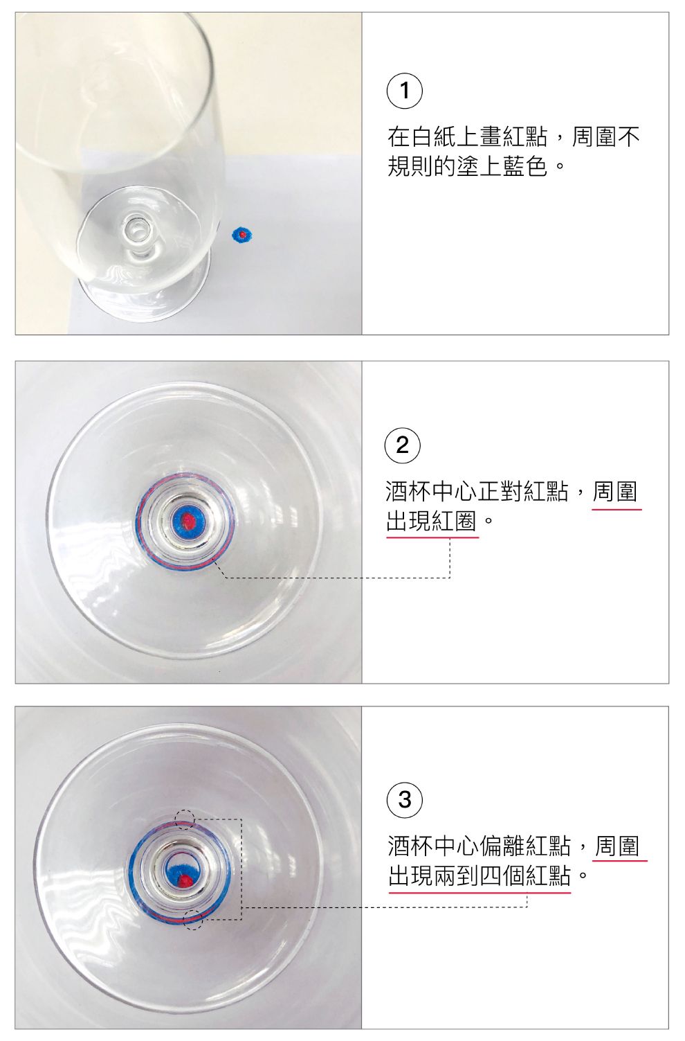 網友NASA松下聰樹以一個高腳酒杯和一張紙,巧妙解釋這個神秘的天文現象。他在白紙上畫了一個紅點,周圍不規則的塗上藍色。接著把酒杯放在圖案上,如果酒杯中心正對著紅點,那我們透過酒杯底座 (扮演透鏡),可以看到藍色的環帶中間,顯現出一個完整清晰的紅圈。如果酒杯中心稍微偏離紅點,則會看到兩個或四點構造,散落在不對稱的藍色圓弧之中。讀者不妨自己在家做實驗!