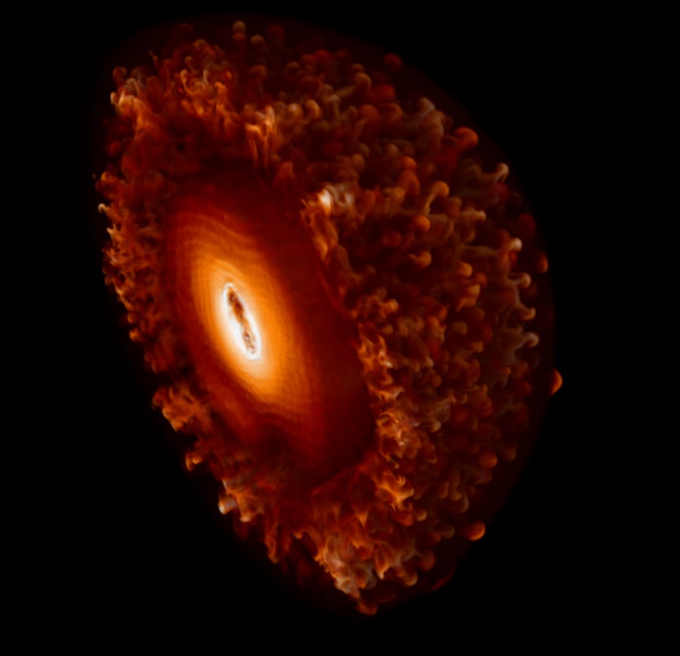 陳科榮以超級電腦模擬磁星驅動超新星爆炸的過程,上圖為將磁星一切為二的三維模型。
