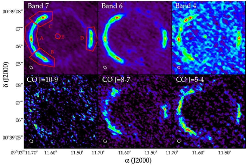 SDP.81 愛因斯坦環。這是地球、40 億光年外之 A 星系、120 億光年外之 B 星系,三個天體同時在一直線上,因為位置剛好加上 A 星系的巨大重力所造成的奇景。