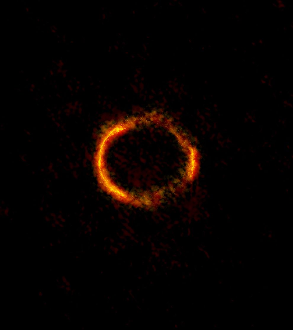 網友ALMA (ESO/NAOJ/NRAO)這張照片是拍攝分子譜線,得到金牛座 HL 原行星盤的氣體分布,同樣有環與間隙。