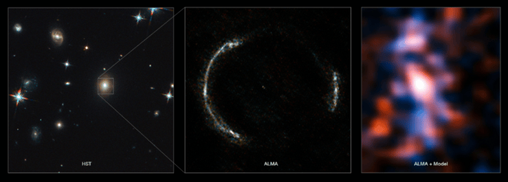 天文學家從 ALMA 影像(中)重建出背景星系的樣貌(右),目睹 120 億光年外的異世界。透鏡星系是橢圓星系,通常不會發出電波,所以在 ALMA 的波段可以不受透鏡星系干擾,清楚分辨來自背景星系的光。再加上 ALMA 有夠好的解析度和靈敏度,才能看清楚愛因斯坦環,並執行以上的計算。