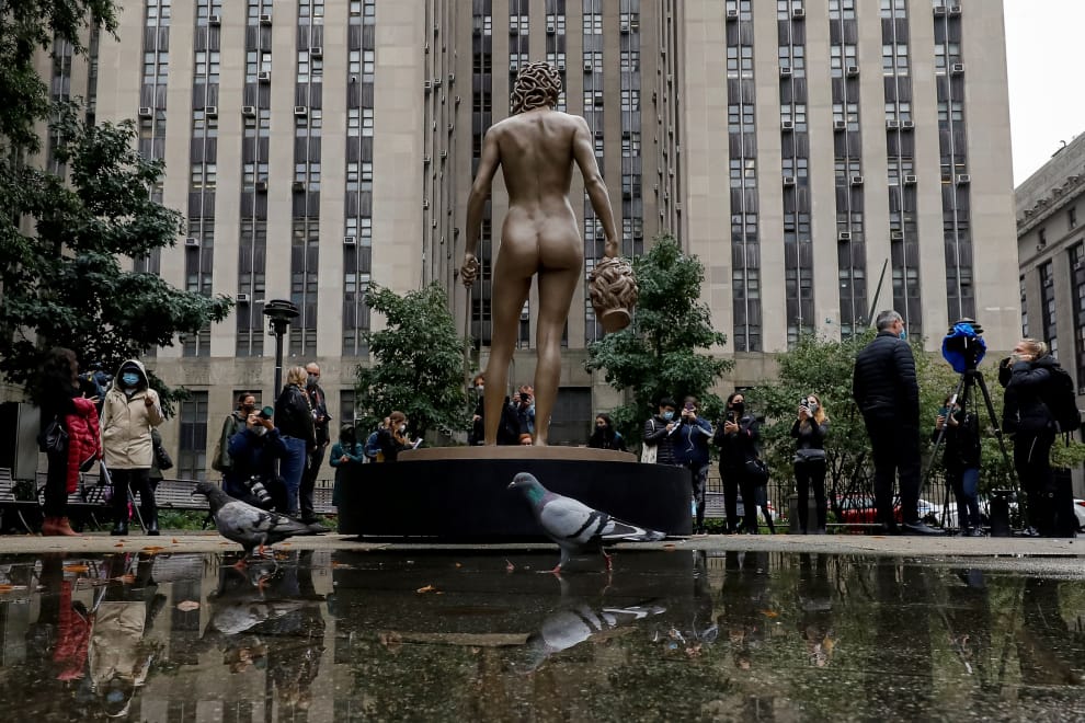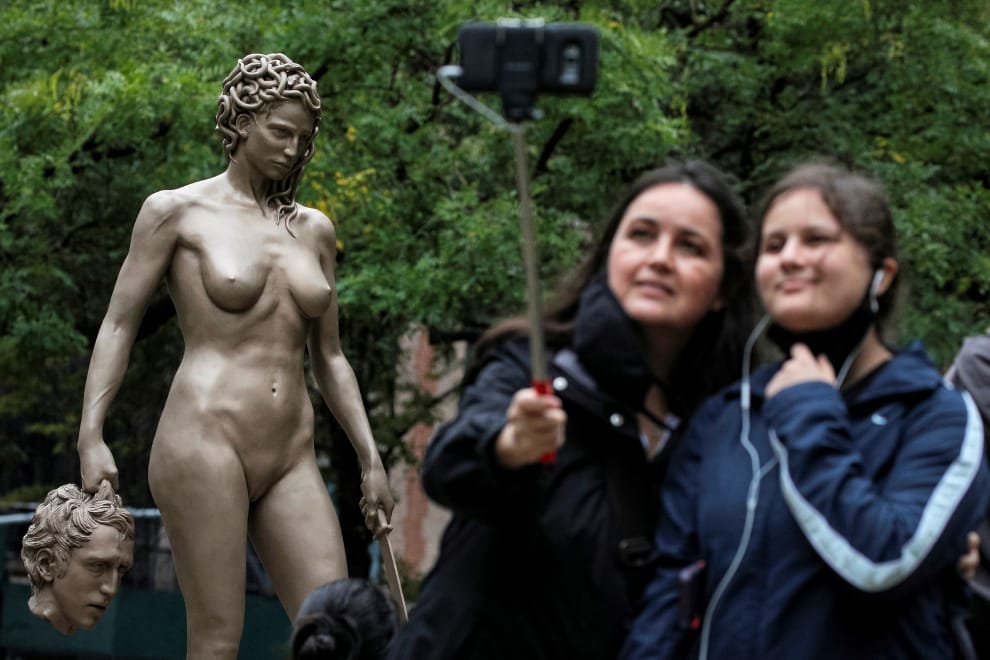 作為對 2017、2018年期間#MeToo(#我也是)運動的一項紀念,義大利藝術家加巴蒂(Luciano Garbati)的雕像作品《美杜莎與珀爾修斯的頭》(Medusa With the Head of Perseus)在周二(13)時,移入紐約市曼哈頓的池塘公園(Collective Pond Park),對面就是犯下多起權勢性侵案的好萊塢前王牌製片人韋恩斯坦(Harvey Weinstein)今年年初被定罪的法院。