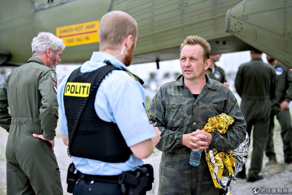 在這張拍攝於 2017年8月11日的照片中,拿著水瓶和保暖毯的男子(右一)就是丹麥發明家麥德森,他在潛水艇「鸚鵡螺號」沉船前跳船游向哥本哈根港口。圖為他上岸後和丹麥警察說明情況的畫面。