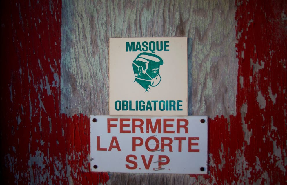 這幾十年來,石棉的危害逐漸引起重視。圖為 2012年在加拿大魁北克省的塞特福德礦城(Thetford Mines),一座廢棄礦坑的門口貼了一張標語,提醒著大家進入前務必要戴口罩。