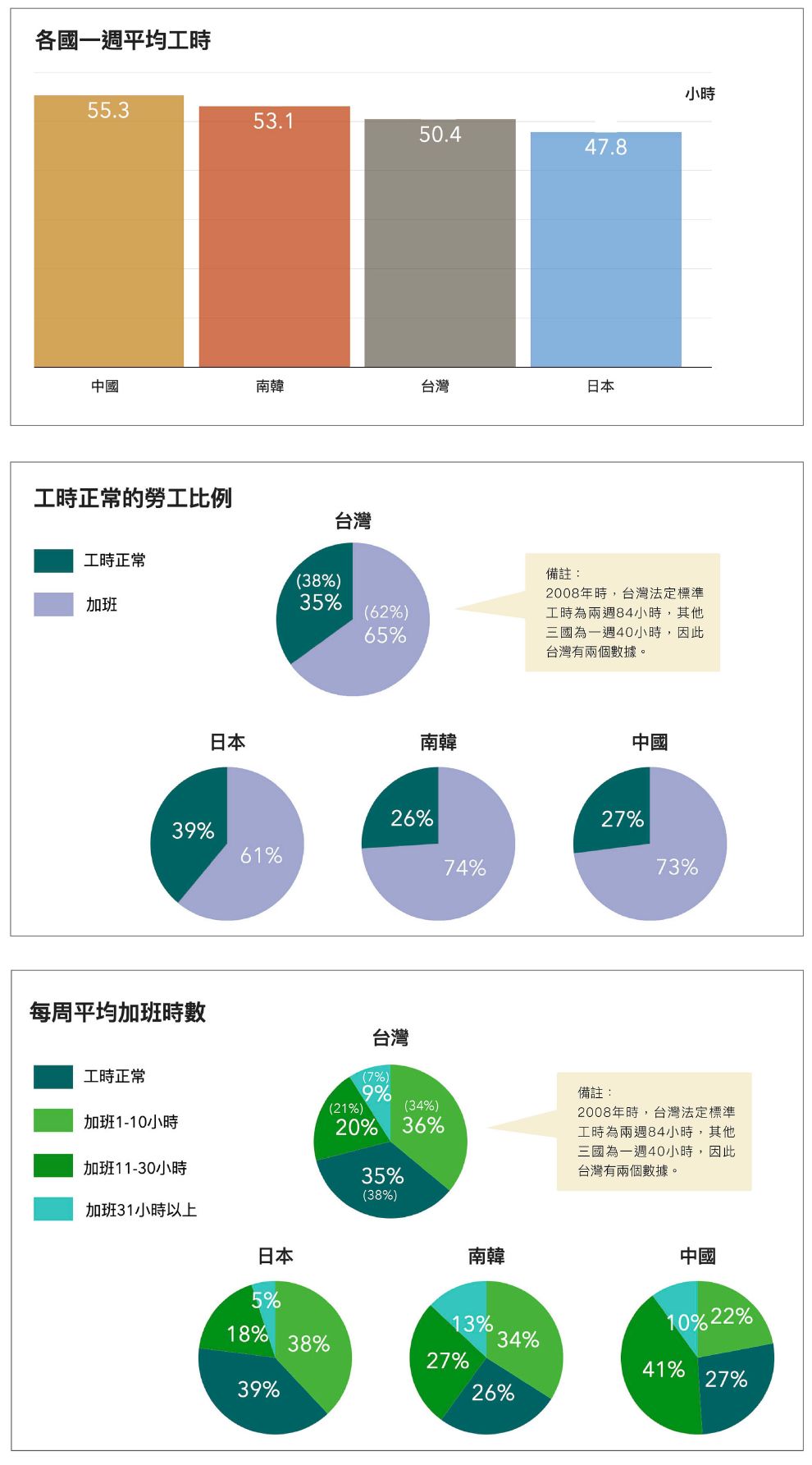 依據 2008 年東亞社會調查問卷資料,以每週工時來看,從高至低依序為中國、韓國、台灣、日本,但四國都有超過 6 成勞工要加班。