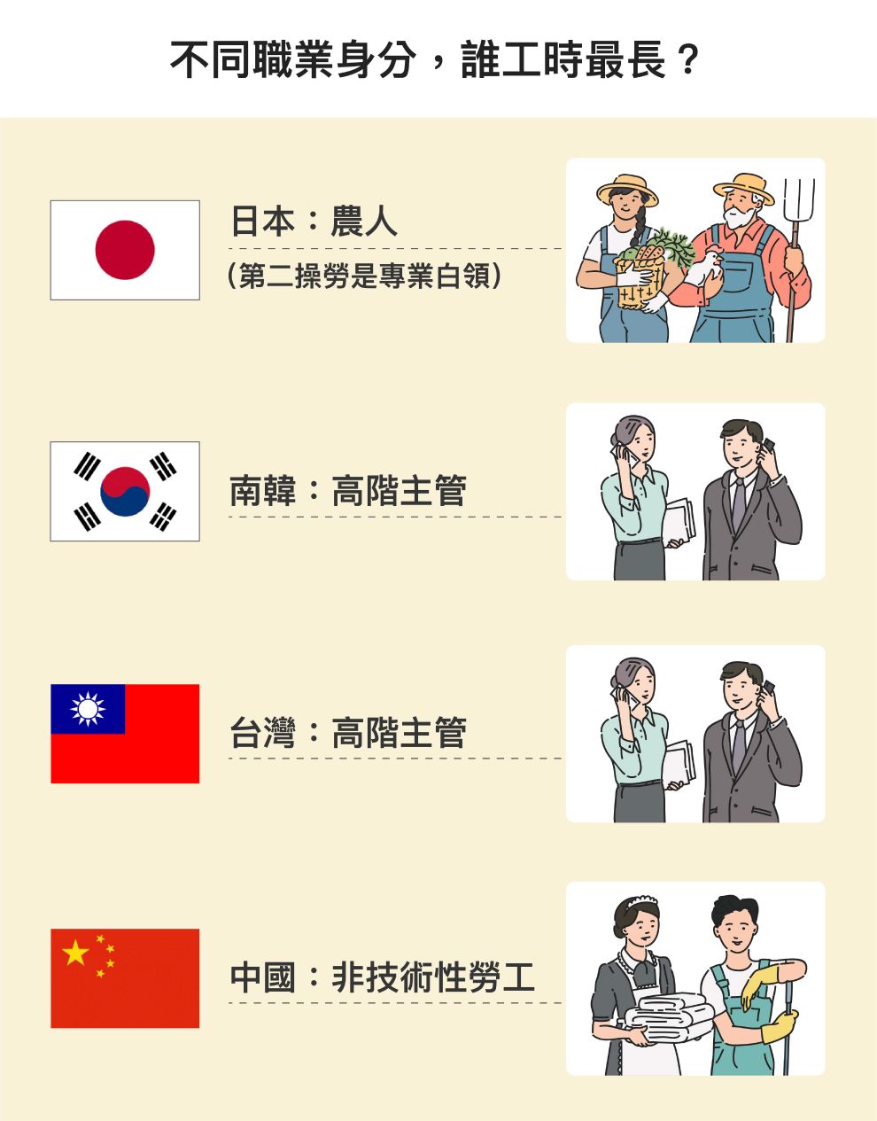 研究中將職業身分類型分為:高階主管或經理人、專業白領、半專業人員、文書工作、農業工作者、資深技師、非技術性工人。台灣與南韓的高階主管,日本的專業白領,加班時數明顯較長;但中國則是非技術性勞工最常加班。