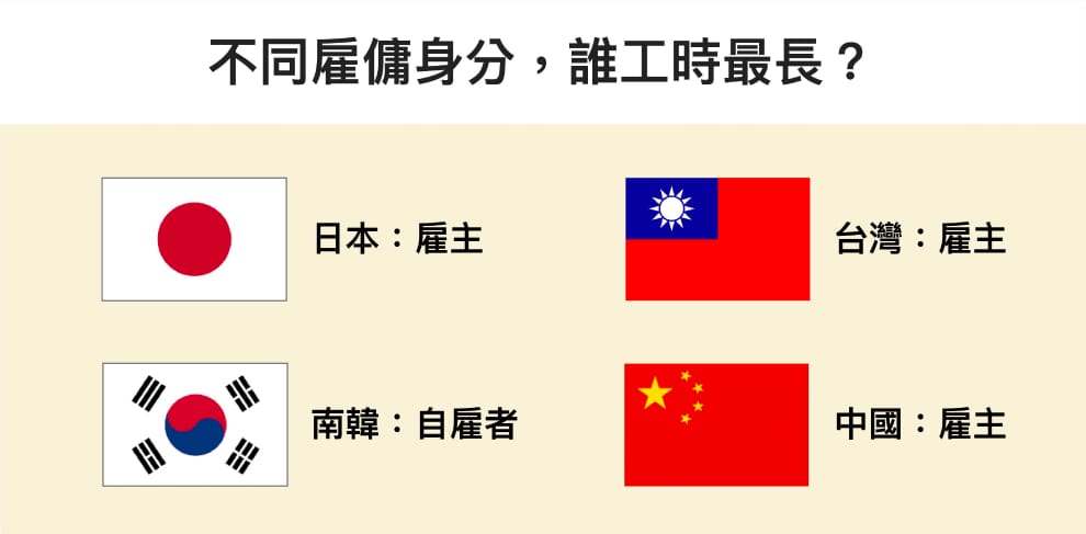 統計顯示,比起受雇者,四個國家的雇主工作時間都更長。除了日本以外,其他三國的自僱者也比一般上班族更常超時工作。甚至,那些在自家公司工作的中國人,工時也比受僱員工還要長。
